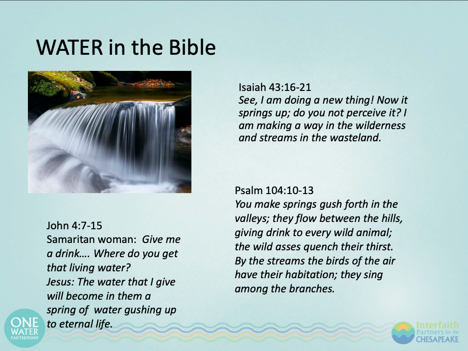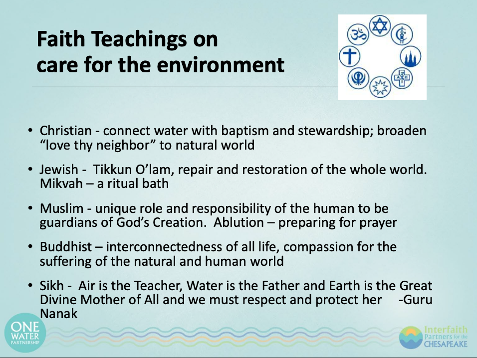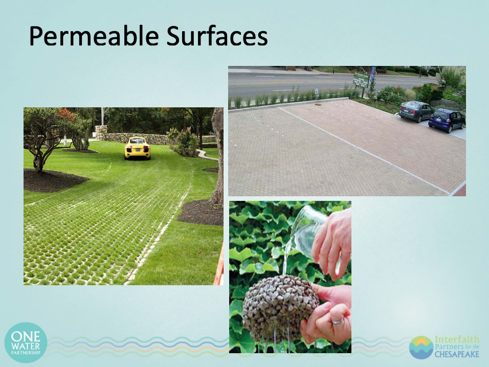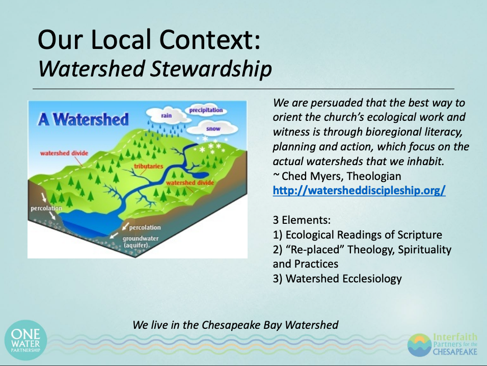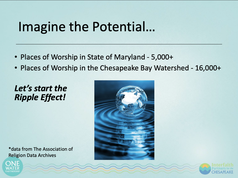 Bonnie Sorak, Senior Outreach Coordinator for the Interfaith Partners for the Chesapeake (IPC) implored attendees to accept responsibility as people living/working/worshiping in this area, to reduce stormwater runoff from our properties so we can reduce our negative impact on the Loch Raven Reservoir. Bonnie introduced several methods such as rain gardens and conservation landscaping, and showed cool examples of pervious driveways that have replaced concrete/asphalt driveways, allowing the storm water to "slow down, spread out and soak in" close to where it meets Mother Earth the first time. Bonnie Sorak: Bonnie@InterfaithChesapeake.org; 443-799-0349
