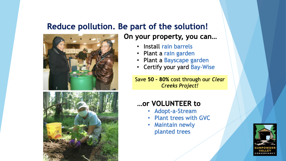Amy Young of the Gunpowder Valley Conservancy's Clear Creeks Program informed attendees of the ongoing, meaningful and productive clean-ups and planting opportunities in our area. Amy's contact information is: Amy Young: ayoung@gunpowdervc.org; 410-404-4748